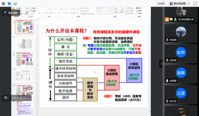 本次教研活动的主题分两部分,首先是周义莲老师的《计算机组成原理》课程建设,周老师介绍了计算机组成原理的课程目标、内容、实践环节设置,并详细介绍了线上平台建设情况,深入地介绍了题库、线上测验、形成性评价的规划和实施。第二部分,李沁主任随后介绍了南京大学计算机系培养方案中硬件课程群的设置情况,着重阐释了《数字逻辑和组成原理》课程内容的安排,以及和其他几门硬件课程的关系。陆勤、刘宏申等硬件课程老师发表了自己的看法,畅谈了对课程改革的必要性,也表达了对学校办学定位和可能会遇到的困难的思索。程院长在总结中充分肯定了计算机组成原理课程组课程建设的工作成果,也对本专业2022版培养方案的修订做了布置。