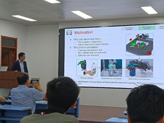 梁洪濯表达了自己对母校bwin必赢线路检测及本硕期间导师的感恩,就自己在德国汉堡大学实验室中所做的机器人相关研究进行了系统介绍,分别介绍了机器人的发展现状、机器人拿取物体的原理、强化学习及深度学习在机器人拿取动作中的应用及实际视频展示。他表示机器人是一个值得研究的领域,鼓励学生们投入更多兴趣对此进行研究。