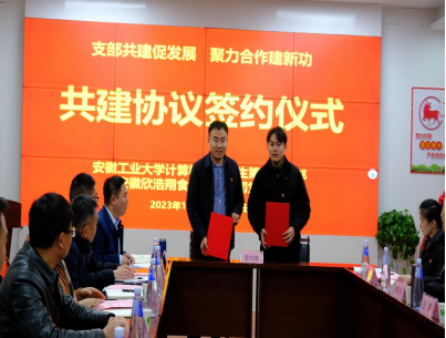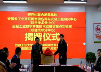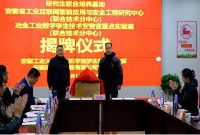 安徽欣浩翔食品有限公司总经理、党支部书记高亚成和我院学生第五党支部书记鲁齐签订支部结对共建协议,与会领导先后为“研究生联合培养基地”、“安徽省工业互联网智能应用与安全工程研究中心”、“冶金工业数字孪生技术安徽省重点实验室”揭牌。