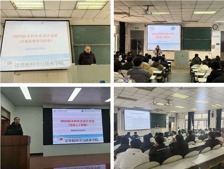 为进一步提高毕业设计质量,确保毕业设计工作更加规范、高效、有序的开展,12月25日上午,学院人工智能、计算机科学与技术、软件工程、物联网工程等四个专业先后召开2024届毕业生毕业设计动员会,会议分别由计算机科学与技术系主任李沁、软件工程系主任薛伟、物联网工程系副主任卫琳娜、人工智能系副主任阮越主持,院长吴宣够、副院长程泽凯、全体指导毕业设计老师、毕业班辅导员及全体毕业班学生参会。