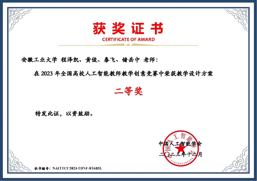 近日,我院《数据结构》课程教学团队程泽凯、黄俊、秦飞、储岳中老师组队参加2023全国高校人工智能教师教学创意竞赛,获教学设计方案二等奖。