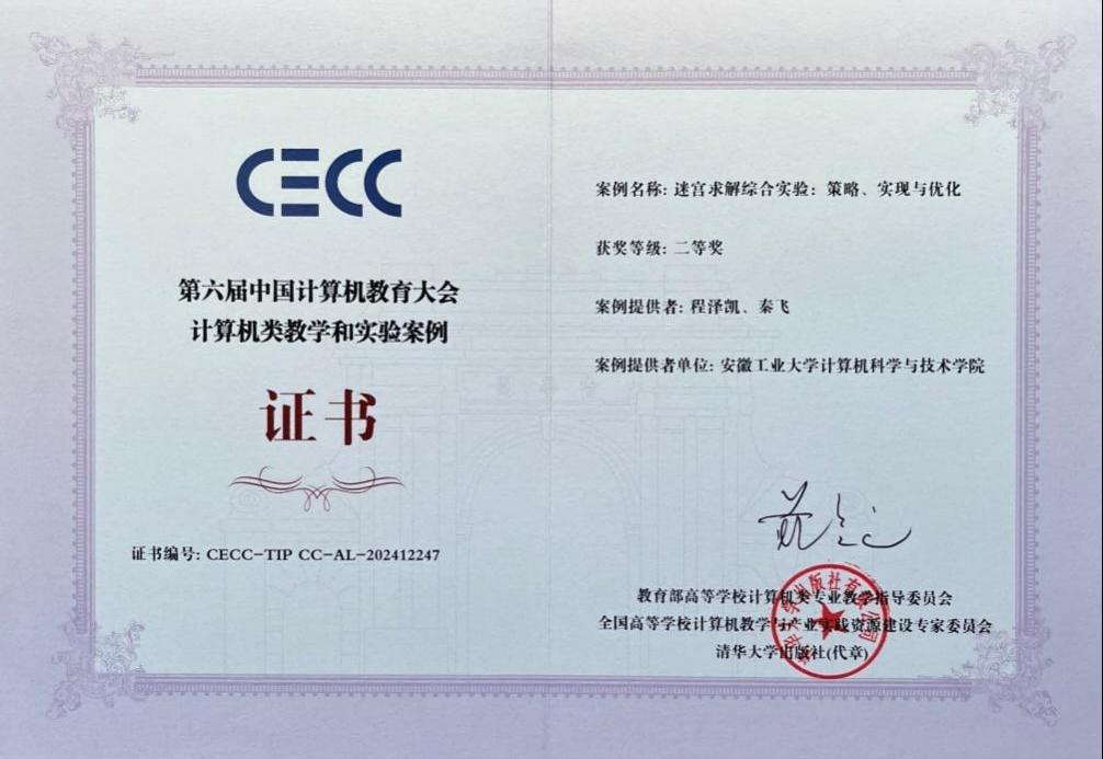 12月6日-8日,第六届中国计算机教育大会(CECC)在福建厦门国际会议中心召开。会上,计算机类教学资源建设论坛公布了入围优秀计算机类教学资源建设课程配套资源与教学案例的评选结果。我院程泽凯、管工学院秦飞老师联合申报的《迷宫求解综合实验:策略、实现与优化》入围,荣获“计算机类教学和实验案例”二等奖。本次大会以深入学习贯彻党的二十届三中全会和2024年全国教育大会精神为指引,致力于将教育发展、科技创新与人才培养三者紧密结合,共同推进,加快高质量计算机教育体系建设。
