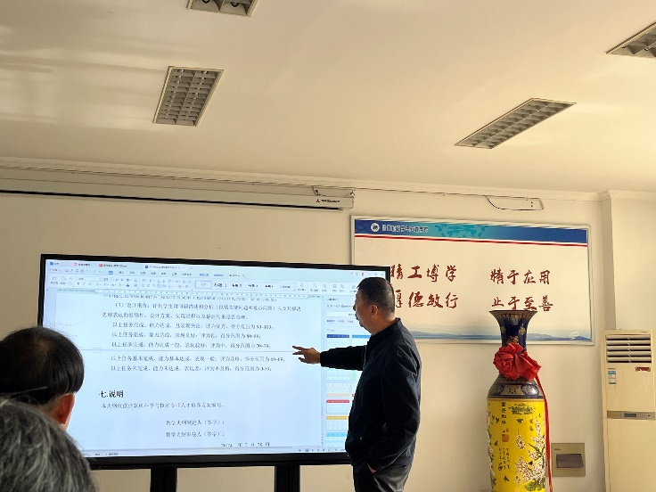 与会教师就审核评估、课程大纲撰写、课程思政融入课程大纲、教案、课堂等问题跟胡学钢、王浩教授进行了深入研讨。
