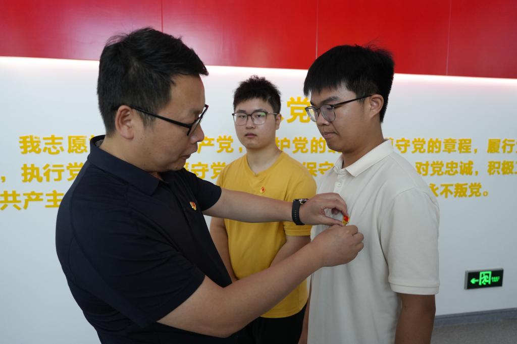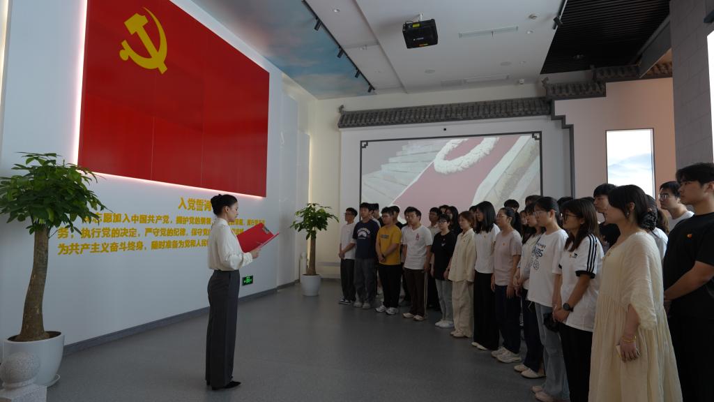 参观结束后,学院2025年上半年新发展党员入党宣誓仪式在庄严的《国际歌》中拉开帷幕。学院党委宣读了新发展党员名单,院领导班子为新发展党员佩戴党员徽章。随后,在领誓人林颖的带领下,全体新、老党员面向鲜红的党旗,举起右手,握拳过肩,以洪亮而坚定的声音宣读入党誓词。宣誓结束后,新党员代表吴海洋深情发言:“从今日起,我们将以党员标准严格要求自己,不断提高自身综合素质,发挥先锋模范作用,用实际行动践行初心!”老党员代表罗思立结合自身成长经历,分享了成长感悟,希望新党员坚定理想信念,提高政治站位,牢记初心使命,关心关爱同学。最后,学院党委副书记徐晓寒对全体新党员表示祝贺,并提出了三点要求。一要深学细悟,筑牢信仰之基,做理论学习的“先行者”。二要牢记身份,强化责任担当,做党员意识的“践行者”。三是知行合一,勇担时代使命,做先锋模范的“示范者”。