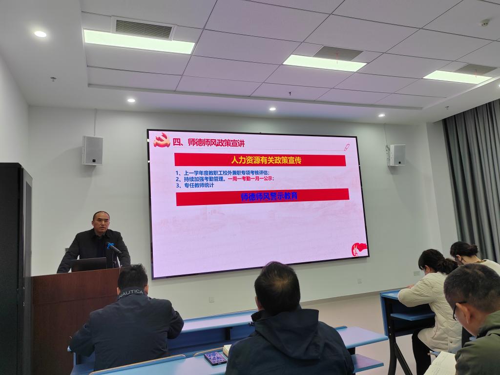 夏玉钦首先带领教职工进行政治理论学习,学习传达了党的二十届四中全会精神,对“十五五”时期经济社会发展的指导方针、主要目标、遵循原则和重要部署进行了详细解读,对学校近期的重要会议精神和重要文件进行了传达,就学院近期的主要活动、获得的荣誉进行了通报点评,并结合具体案例进行了师德师风警示教育。