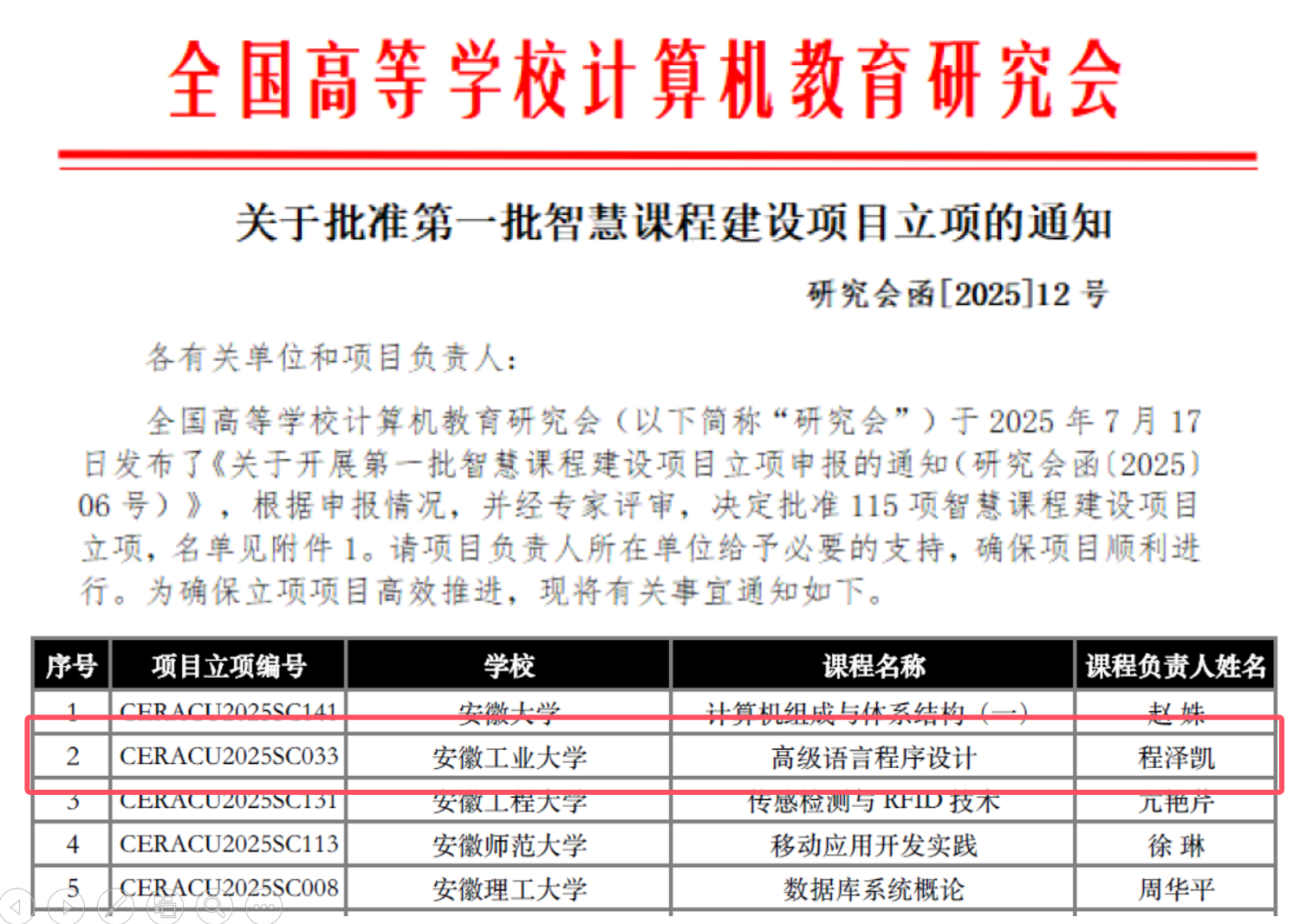 近日,我院《高级语言程序设计》课程成功入选全国高等学校计算机教育研究会公布的第一批智慧课程建设项目。该项目由程泽凯担任负责人,成员包括刘卫红、秦飞、王修君、胡炳文。