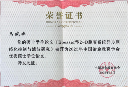 近日,中国冶金教育学会公布2025年优秀学位论文评选结果,我院2024届硕士生马晓峰(导师:周建平)和段李龙(导师:薛伟)的硕士学位论文获评优秀硕士学位论文。中国冶金教育学会是隶属于教育部的国家一级学会。“中国冶金教育学会优秀学位论文评选”由学位与研究生教育分会组织开展,旨在加强高层次创新型人才的培养工作,提升全国冶金院校研究生培养质量和学术水平,培养和激励研究生的创新精神。