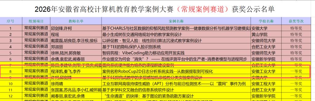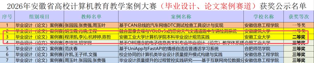 近日,2026年安徽省高校计算机教育教学案例大赛决赛在安徽铜陵成功举办。本次大赛由安徽省高等学校计算机教育研究会主办,我院共派出2支参赛队伍。经过网络初赛、案例展示、现场答辩及专家评审等多个环节的激烈角逐,我院最终取得常规案例赛道一等奖1项,毕业设计(论文)案例赛道二等奖1项。