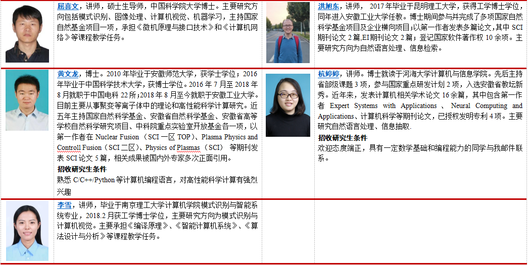 大数据挖掘与智能计算团队是437ccm必赢国际版科研团队之一,团队成员9人,其中教授1人,副教授3人,硕导5人,讲师5人,7人具有博士学位。主要研究大数据挖掘与分析、机器学习、计算机视觉、多媒体内容分析、自然语言处理等方向。近年来承担多项国家级、省部级和企业科研课题,获安徽省科技进步奖1项,中国科学院优秀博士论文奖1项,其它奖项若干。