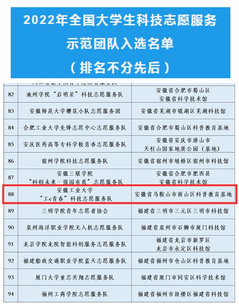 近日,团中央青年志愿者行动指导中心、中国青年志愿者协会秘书处中国科学技术协会宣传文化部联合公布了2022年全国大学生科技志愿服务示范团队入选名单,我校“工e青春”科技志愿服务队成功入选。此次全国共遴选300支团队,安徽省获批11支。