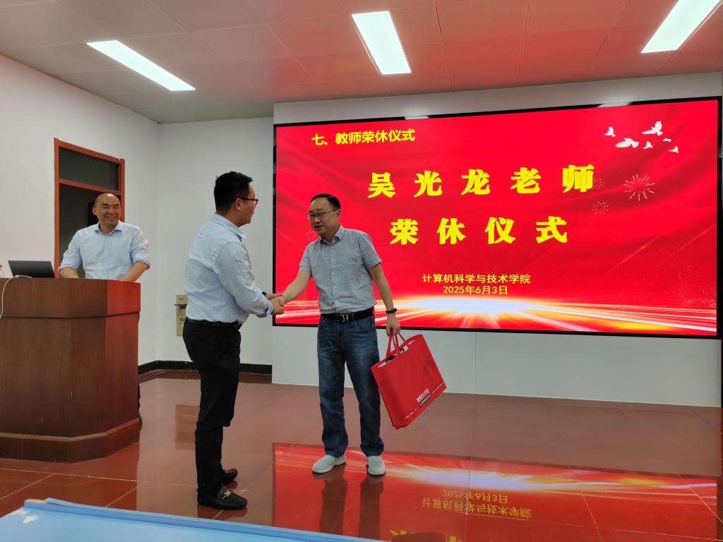 夏玉钦代表学院感谢吴光龙老师一直以来为了学院发展不断勤恳工作和持续付出,希望他荣退后持续关注支持学院发展,也祝他退休后的生活快乐健康。学院副院长(主持工作)黄俊代表学院给吴光龙老师发放了退休慰问品。