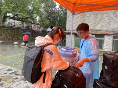 为确保2022级新生入学报到高效、有序、安全,学院在三天前开始布置迎新活动,对新生引导和报到流程进行统一规范,报到当天恰逢阴雨绵绵,但迎新热情依旧高涨,有院旗接应、有耐心引导、有新生咨询,志愿者担负起新生行李搬运和引导工作。校园内,志愿者们活跃奔走在各个地点,帮忙搬运行李,为新生指引道路,热忱接待每一位到校新生。新生报到处,从新生信息录入、领取新生物资、提交档案、绿色通道事项办理等,所有工作都有条不紊的进行着。一位来自计算机大类专业的安徽籍学生谈到,“对学校的第一印象是老师和学长都特别热情;细心的疫情防控、暖心的志愿帮助、贴心的关怀问候,让我们全国各地奔赴而来的新生感到温暖”。第一次见面伴着微风细雨、些许狼狈,但新生的欣喜与热情也从话语交谈间流露出来,连续“作战”的志愿者依旧热情洋溢、精神饱满。