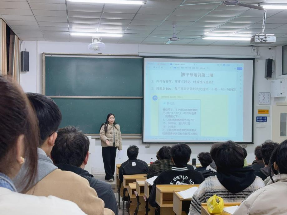 班干部是班级建设的关键,是学生和老师联系的桥梁。为了提高班级管理效率,培养强有力的班干部队伍,3月12日晚,437ccm必赢国际版在佳山校区教一106组织召开班干部培训会,本次会议由辅导员奚锡珍、朱筱主讲,2023级全体班干部参加。