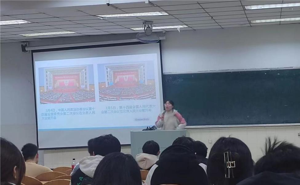 冯晟从“两会知识科普”、“全国两会常用词”、“今年两会新看点”三个方面展开宣讲。其中在解读“政府工作报告中的‘青年大礼包’”中强调,政府工作报告更首次提出了开展“人工智能+”行动,计算机的未来发展前景无比广阔,同学们要对行业前景充满信心。针对毕业年级党员,她提出党和政府对就业问题高度重视,希望大家在未来的学习生活和职业选择中,能够牢记总书记的嘱托,到祖国最需要的地方去,到人民最需要的地方去。支部学生党员朱卓越表示,全国两会不仅为国家的发展描绘了宏伟蓝图,更是为广大青年指明方向,我们要担起青年之责,勇于创新,积极行动,谱写新华章。