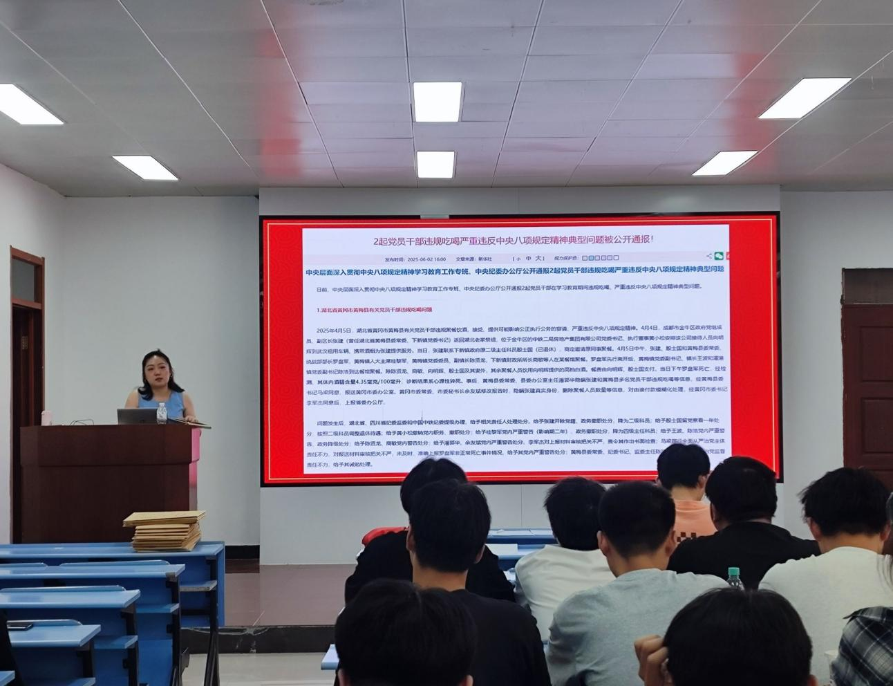 开展一次党课活动,筑牢思想根基。以中央八项规定精神为核心内容的专题党课上,学生第一党支部书记代文嫣结合实际案例,深入解读中央八项规定出台的背景、意义及具体要求。毕业生党员围绕“如何今后的工作和学习生活中贯彻落实八项规定”展开热烈讨论,进一步强化纪律意识和规矩意识,筑牢拒腐防变的思想防线。
