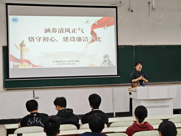 在新学期伊始,为引导大一新生树立正确的世界观、人生观、价值观,筑牢拒腐防变的思想道德防线,营造风清气正的校园文化氛围,计算机学院三位新生辅导员于10月14日晚在教三南203为全体2025级新生举办了一场别开生面的“廉洁教育第一课”。本次活动由新生辅导员冯晟老师主讲,为刚刚踏入大学校门的学子们上了一堂深刻而难忘的廉洁启蒙课。