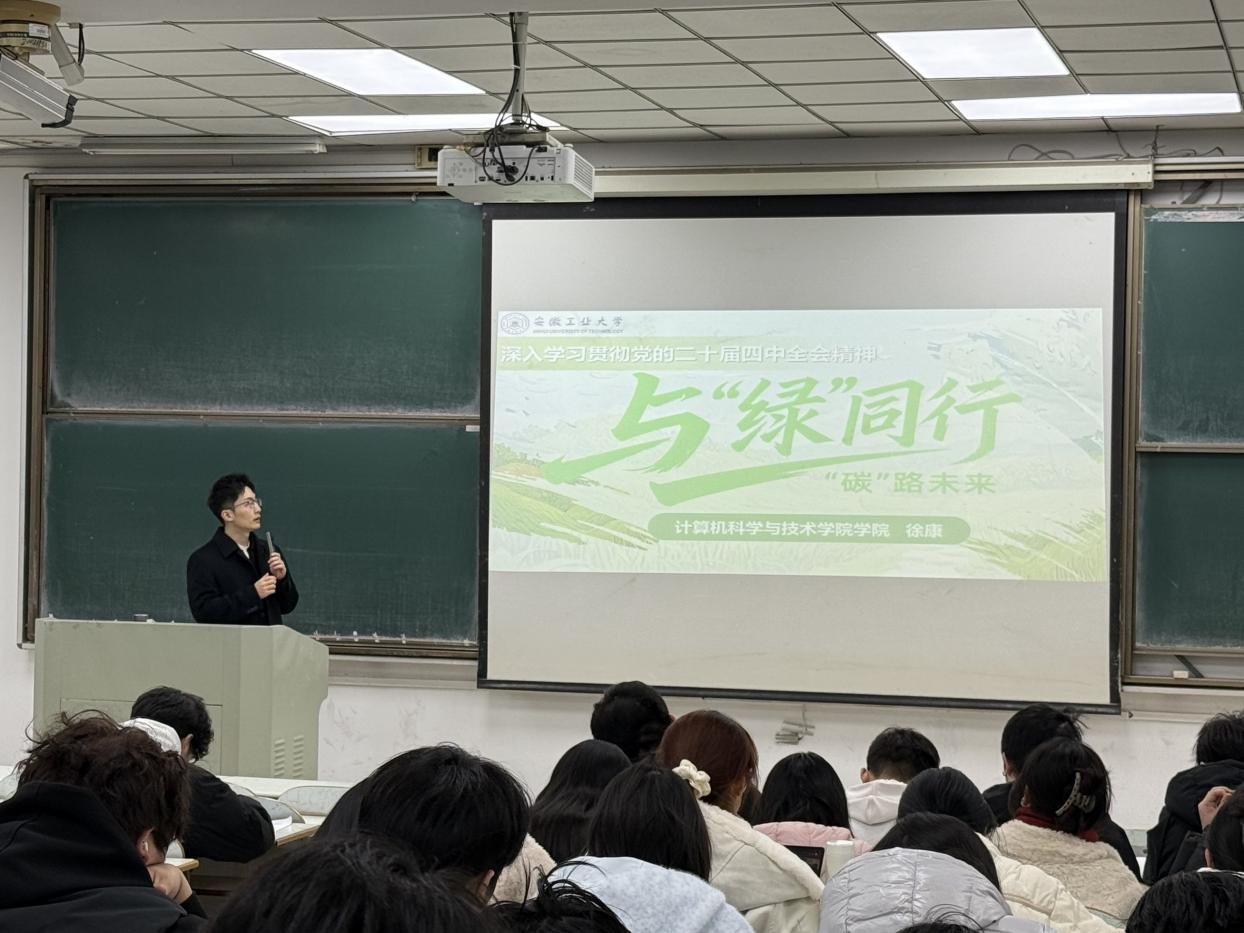 宣讲会上,辅导员徐康围绕党的二十届四中全会关于生态文明建设与绿色低碳发展的重要论述进行了深入解读。他结合计算机科学与技术专业特色,生动阐释了人工智能、大数据、物联网、区块链等前沿信息技术在智慧能源管理、碳排放监测、资源循环利用等关键领域的创新应用与实践路径,揭示了计算技术赋能绿色低碳转型的巨大潜力。在互动交流环节,同学们围绕“绿色算法设计”“可持续软件开发”“智能系统能效优化”等议题展开了热烈讨论。现场气氛活跃,大家纷纷结合专业知识,提出了利用技术手段服务节能减排的多种设想。徐康老师鼓励同学们,要主动将国家绿色发展的战略需求融入学业规划与科研探索,努力成长为兼具扎实专业技能和强烈社会责任感的创新型人才。